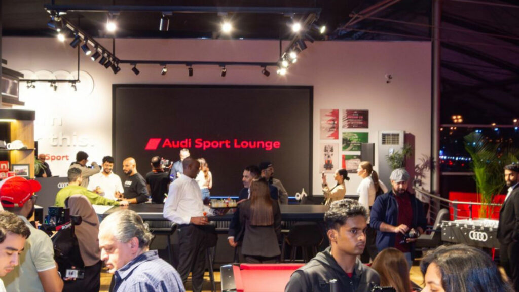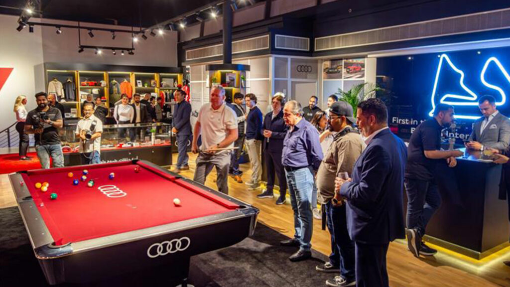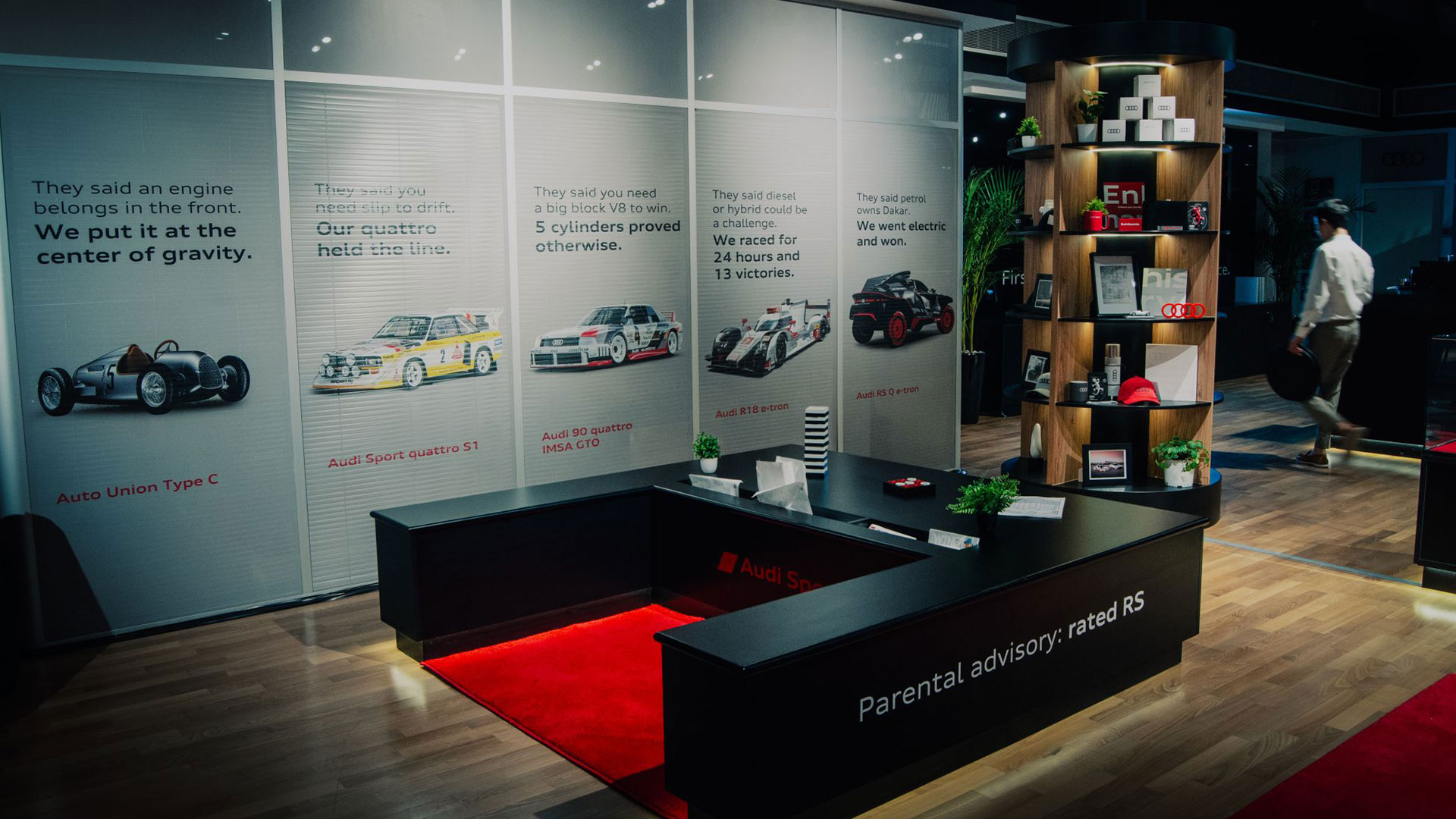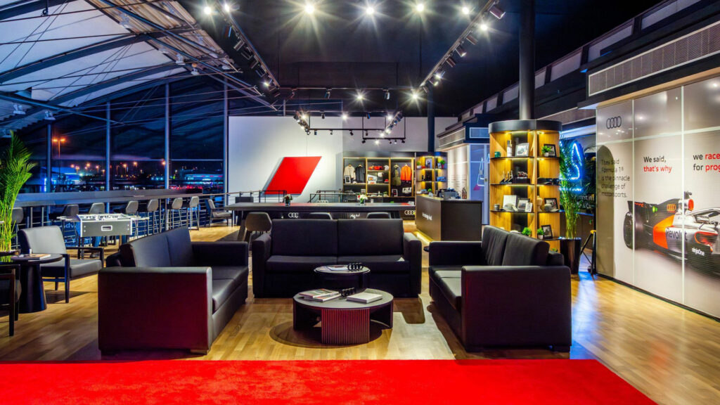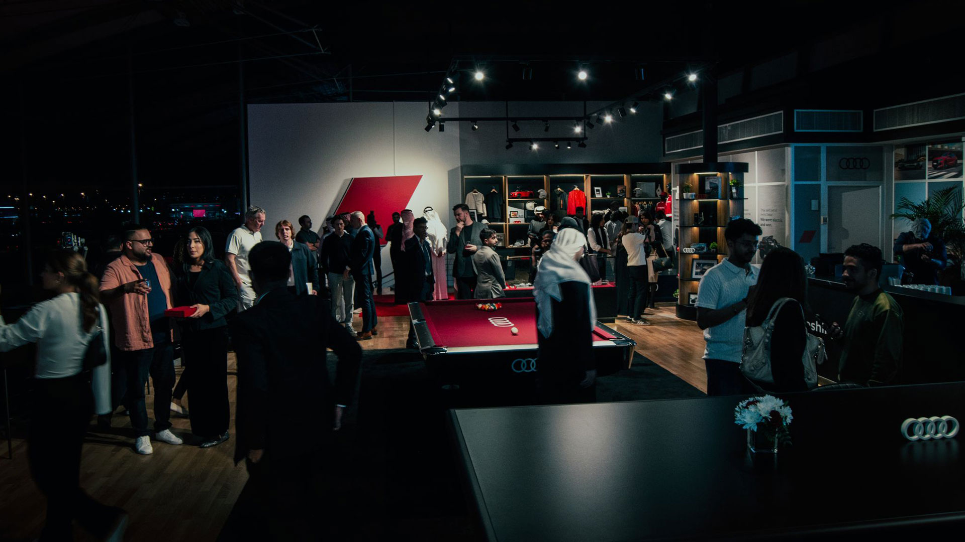 وتتسم الأجواء ببصمةٍ مُميَّزة ولا تُخطئها العين. إذ تُحيط شعارات Audi Sport بتفاصيل المكان، في حين تستقرُّ طرازات العلامة ذات الأداء الفائق لترسِّخ حضورها في المساحة السفلية. وفي الطابق العلوي، تُقدم الصالة المُدشَّنة حديثًا نقطة مشاهدة أكثر خصوصية، وقد صُمِّمَت لتبادل الأحاديث وترقُّب الأحداث وعيش اللحظات المشتركة.